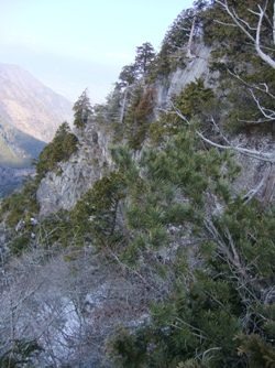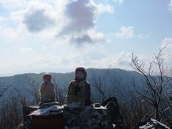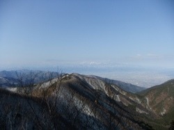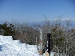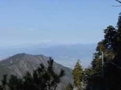 日の当たる釈迦ヶ岳山頂を望む。釈迦ヶ岳の登山道はいくつかあるが、今回は芦川町・上芦川に一番近い登山口から入った。