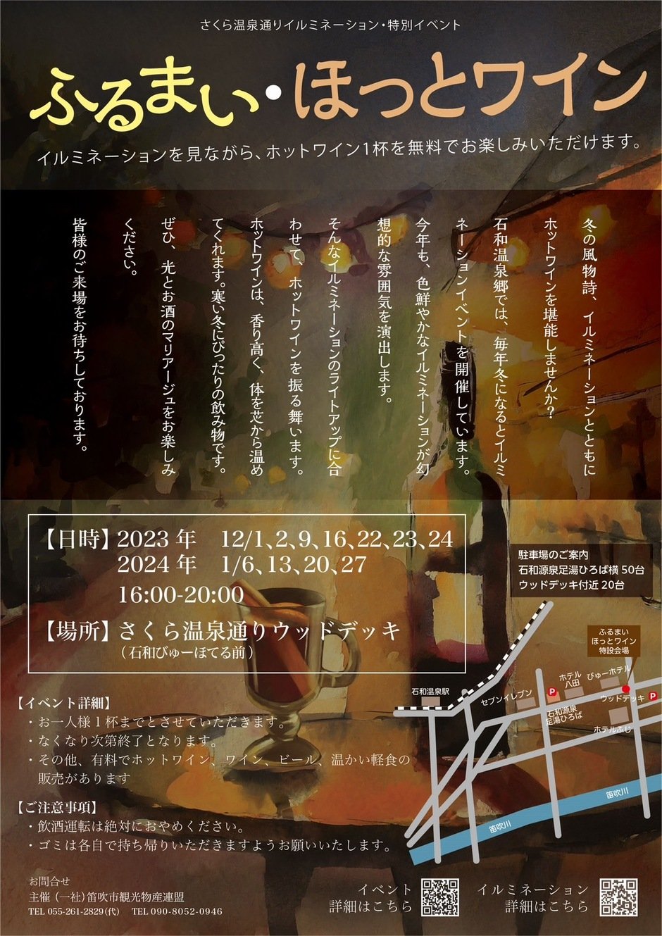さくら温泉通りのイルミネーションに合わせてホットワインを振る舞います。ホットワインは香り高く、体を芯から温めてくれます。ぜひ、光とお酒のマリアージュをお楽しみください!