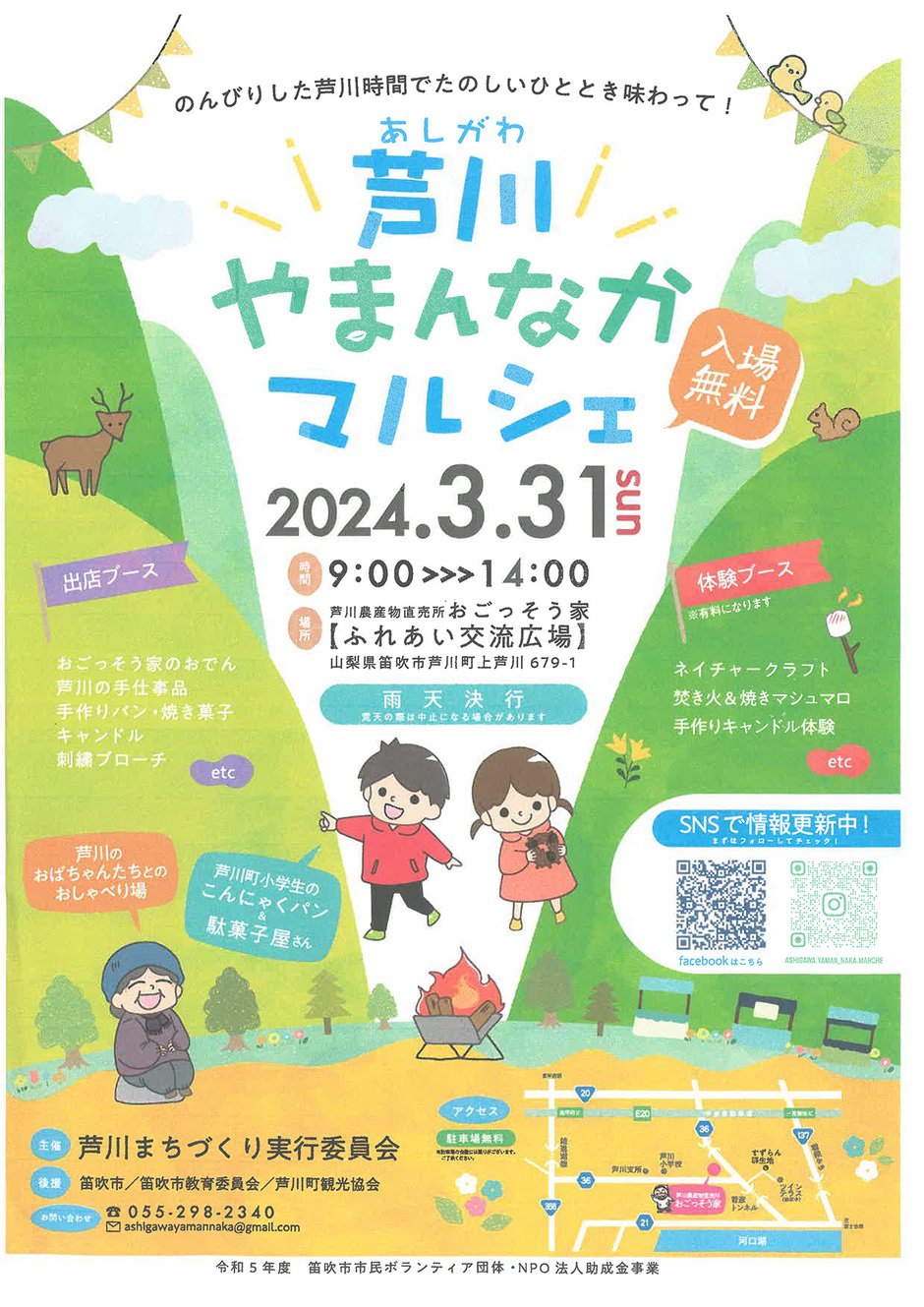 | お問い合わせ | 主催:芦川まちづくり実行委員会 後援:笛吹市・笛吹市教育委員会・芦川町観光協会 お問い合わせ:055-298-2340 メール:ashigawayamannaka@gmail.com |