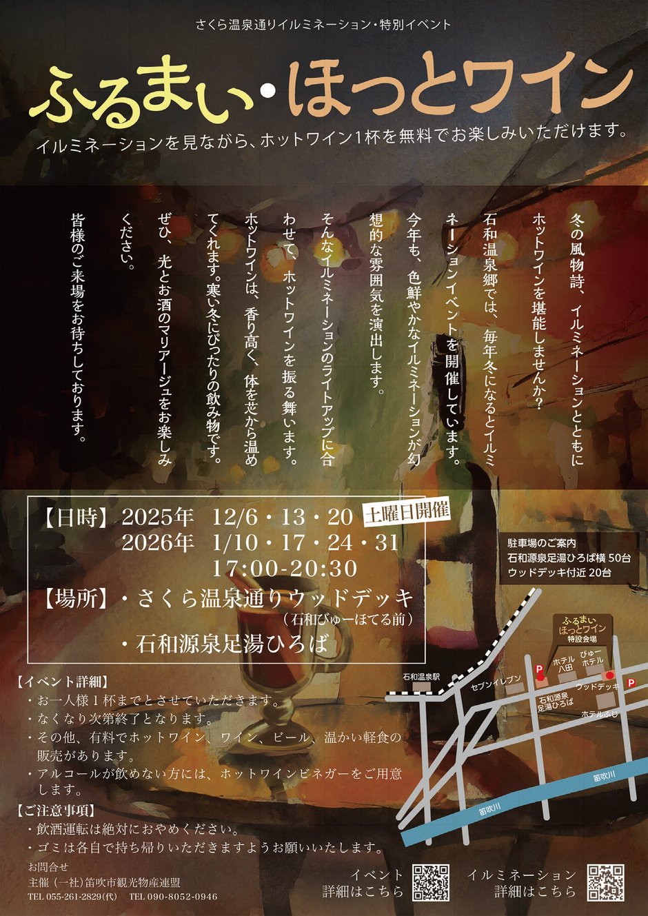 さくら温泉通りのイルミネーションに合わせてホットワインを振る舞います。ホットワインは香り高く、体を芯から温めてくれます。ぜひ、光とお酒のマリアージュをお楽しみください!