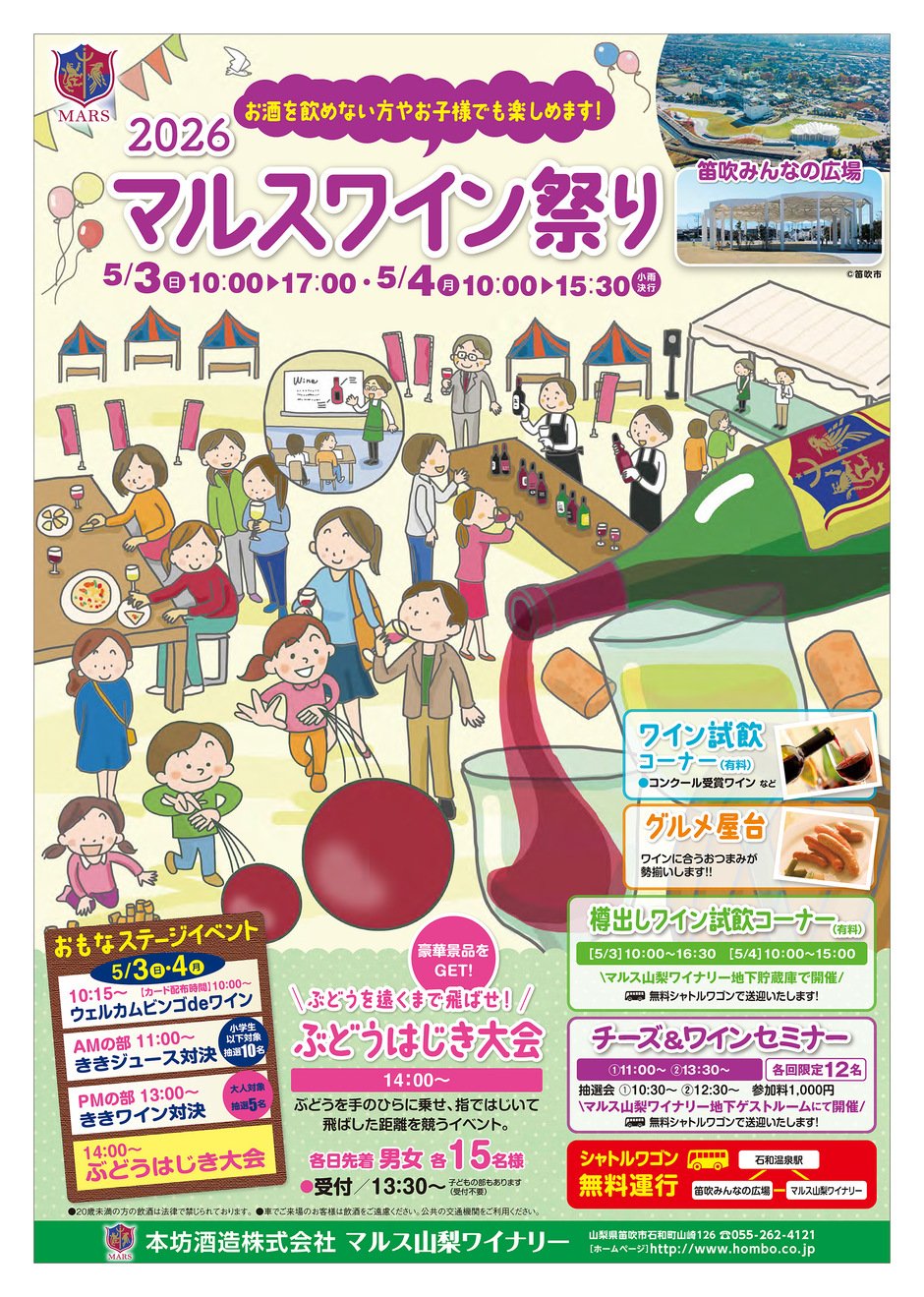 | お問い合わせ | 主催:本坊酒造株式会社 マルス山梨ワイナリー 山梨県笛吹市石和町山崎126 055-262-4121 http://www.hombo.co.jp |