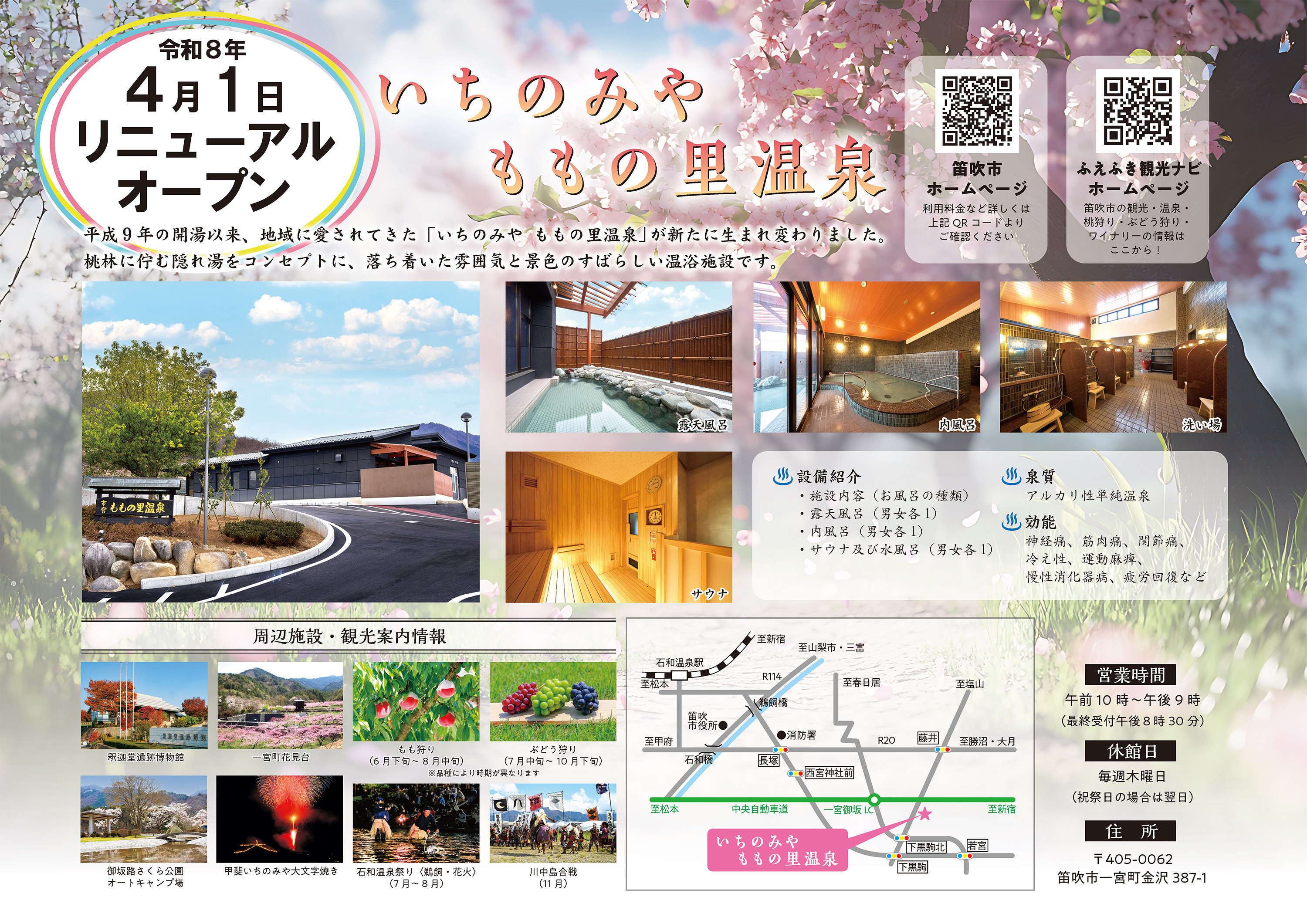 平成9年の開湯以来、地域に愛されてきた「いちのみや ももの里温泉」が新たに生まれ変わりました。