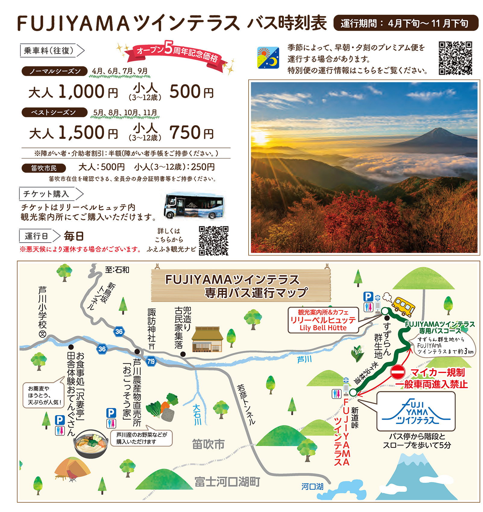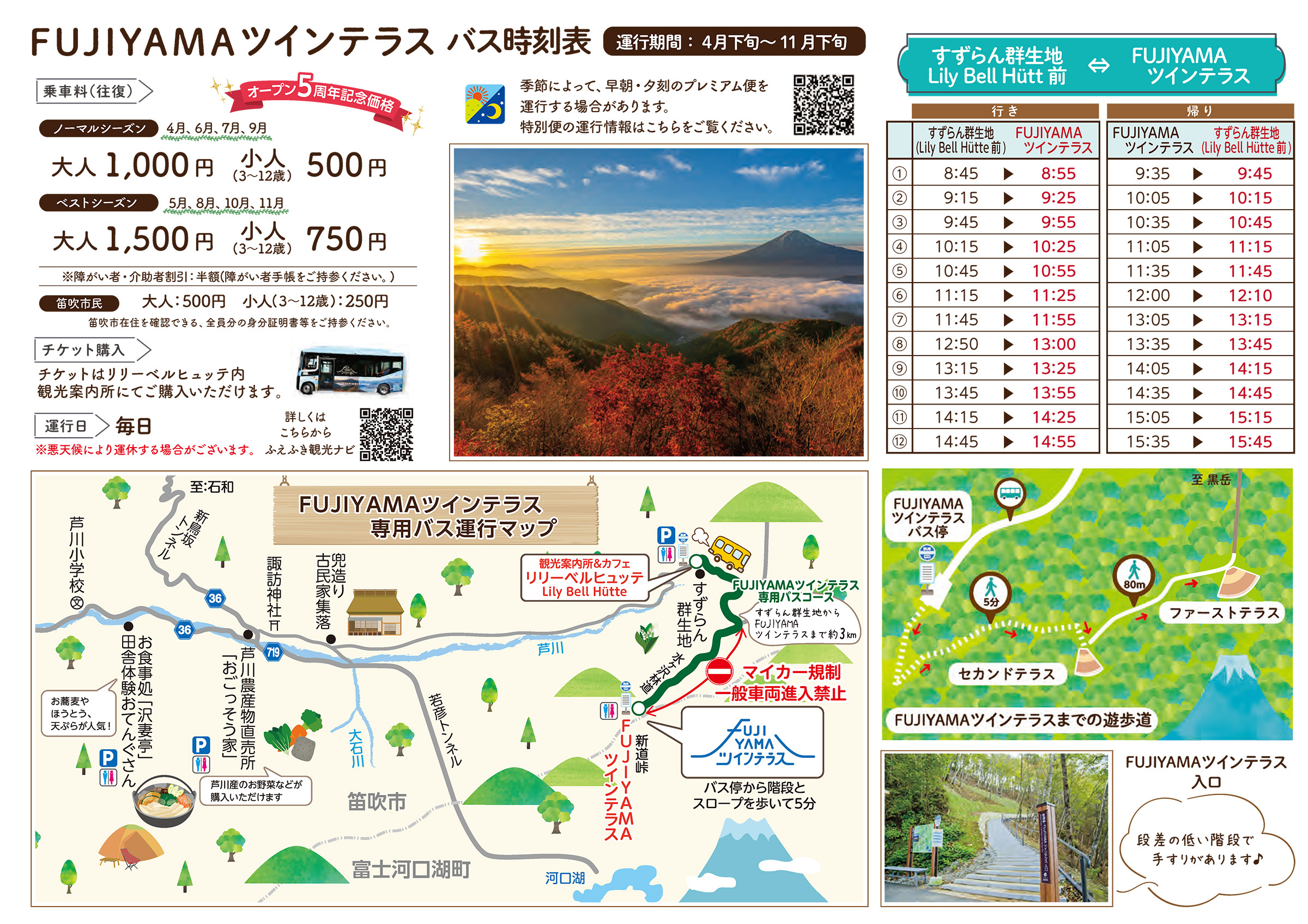 令和8年4月20日からFUJIYAMAツインテラス行きシャトルバスの運行を再開します!今年もFUJIYAMAツインテラスから眺める絶景をお楽しみください!