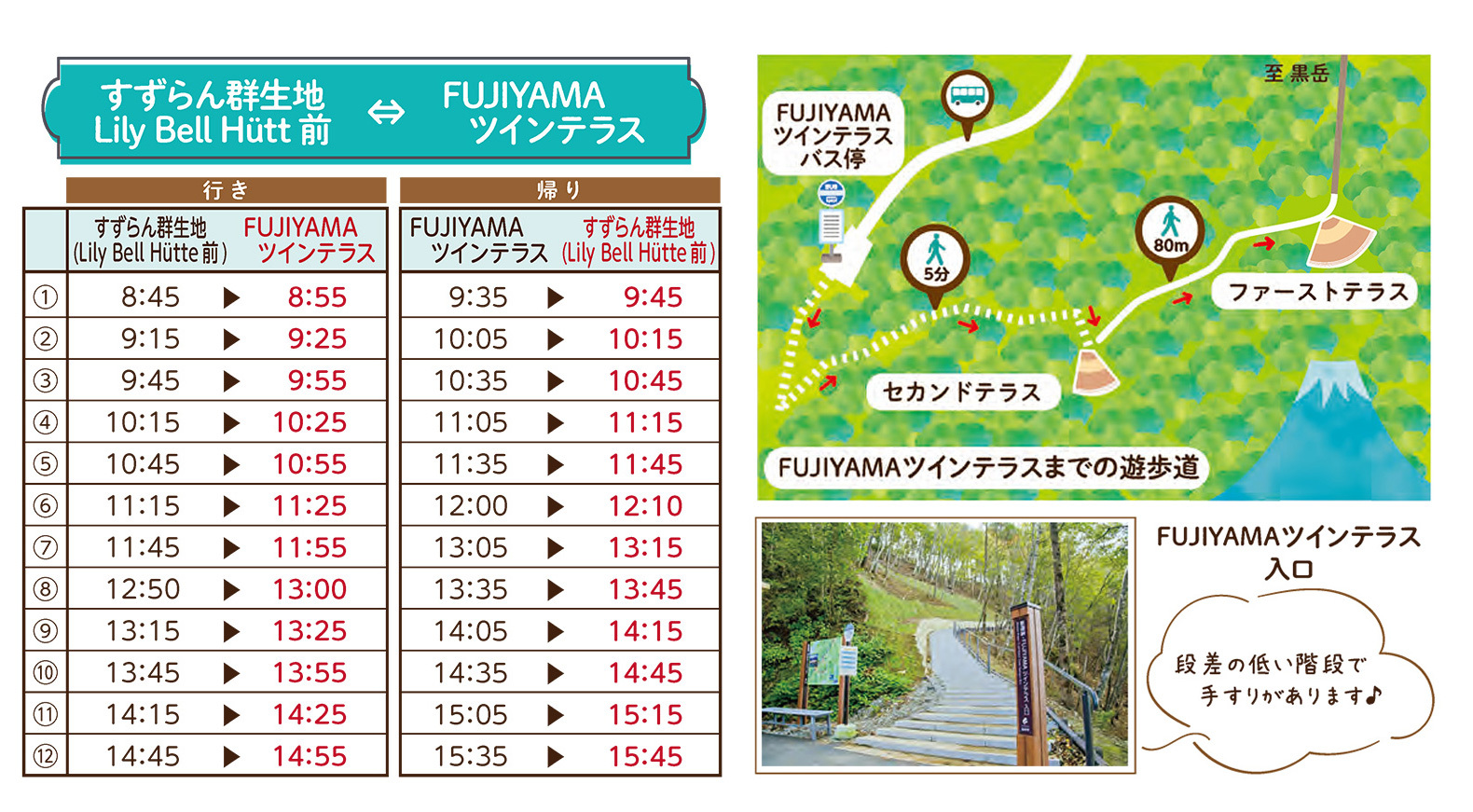 ※バスではなく徒歩でFUJIYAMAツインテラスに行く際は、リリーベルヒュッテから約3kmの坂道を登るため50分程かかります。また、狭い道をバスが通行するためご注意ください。