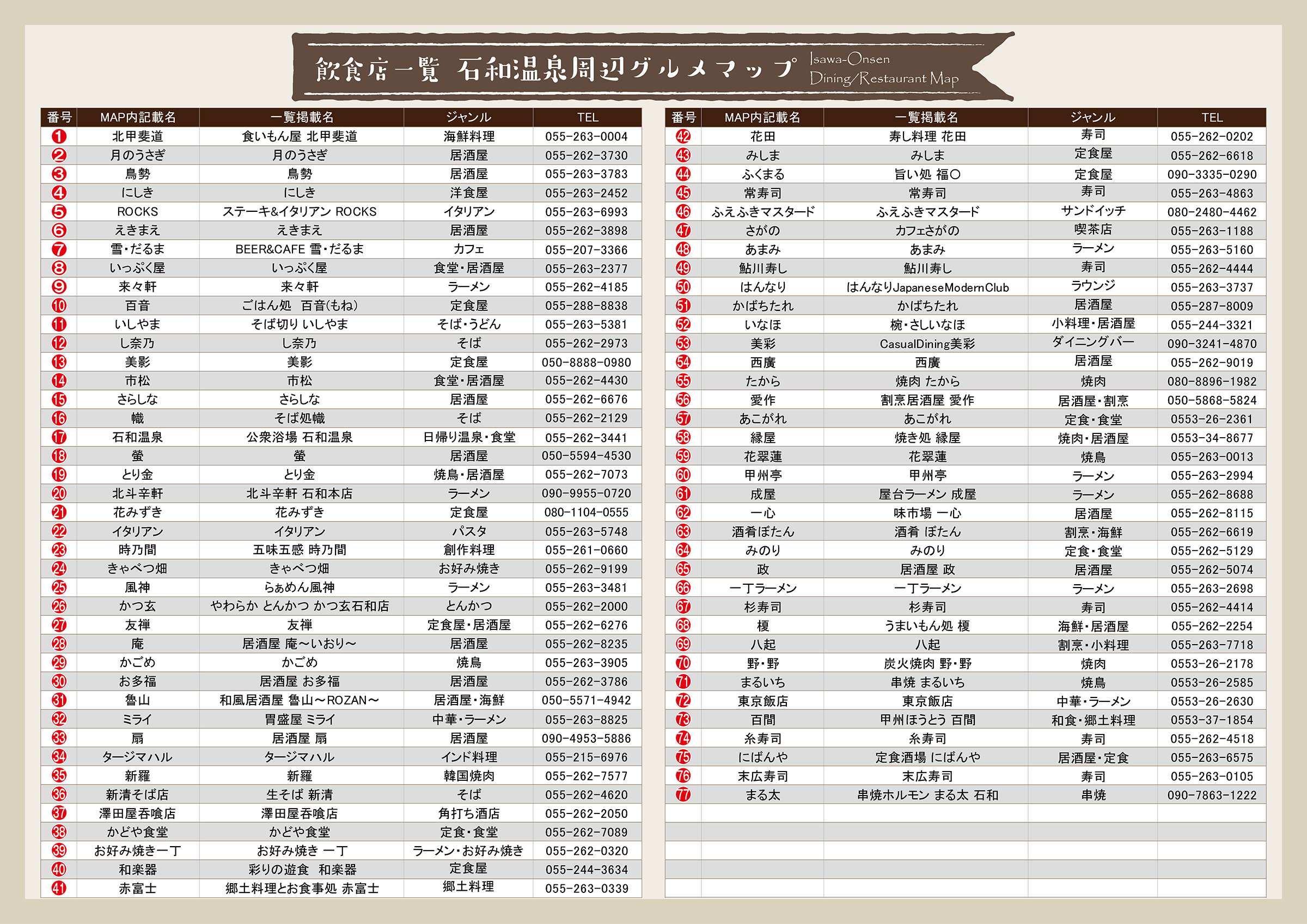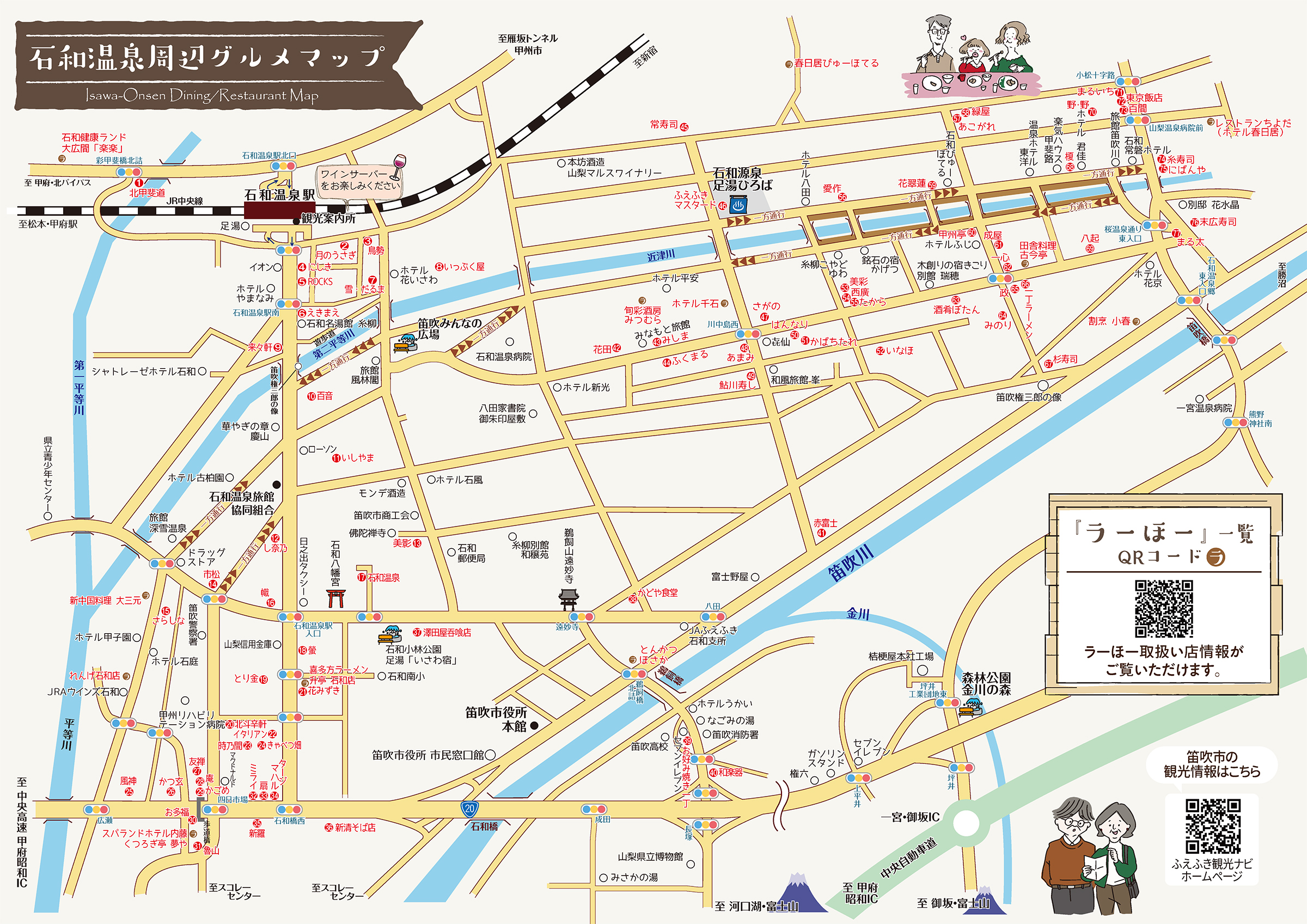 ※石和温泉周辺「ふえふきグルメマップ」内における取扱店舗のラーほー一覧になります。ラーほー取扱店舗一覧は