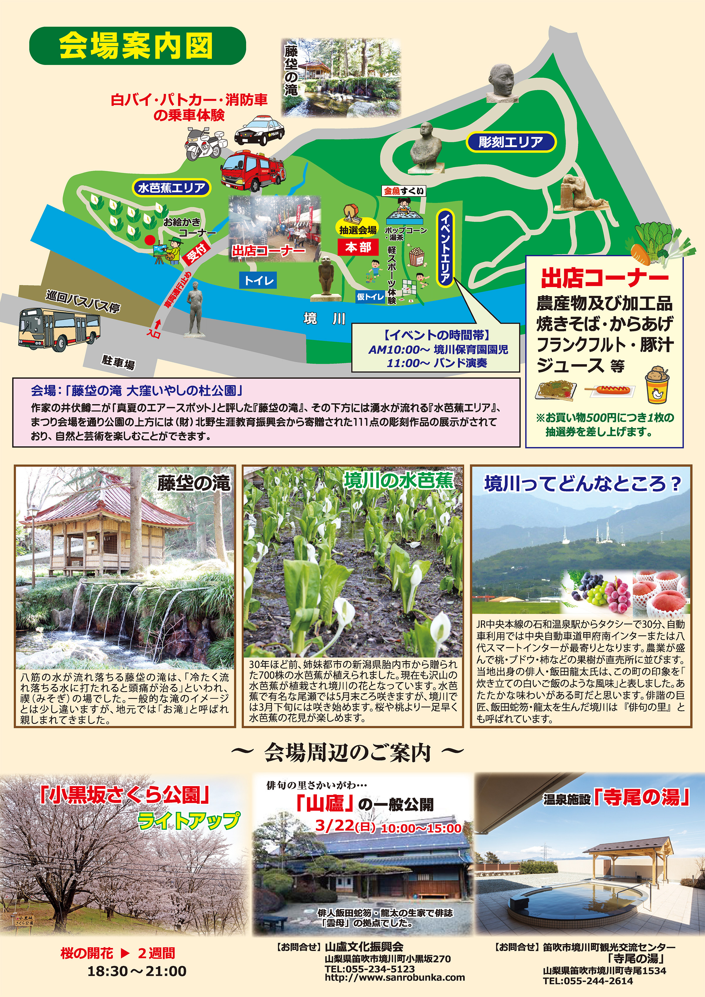 水芭蕉の清流ゾーン・不動堂の歴史文化ゾーン・家族で楽しめるふれあい交流ゾーン、そして境川村出身北野隆春氏が設立した公益財団法人北野生涯教育振興会の支援を受けた奨学生による彫刻芸術作品が106体が設置されています。いやしの森ゾーンと複合型文化交流公園として訪れるものを飽きさせない藤垈の滝・大窪いやしの杜公園をお楽しみ下さい。