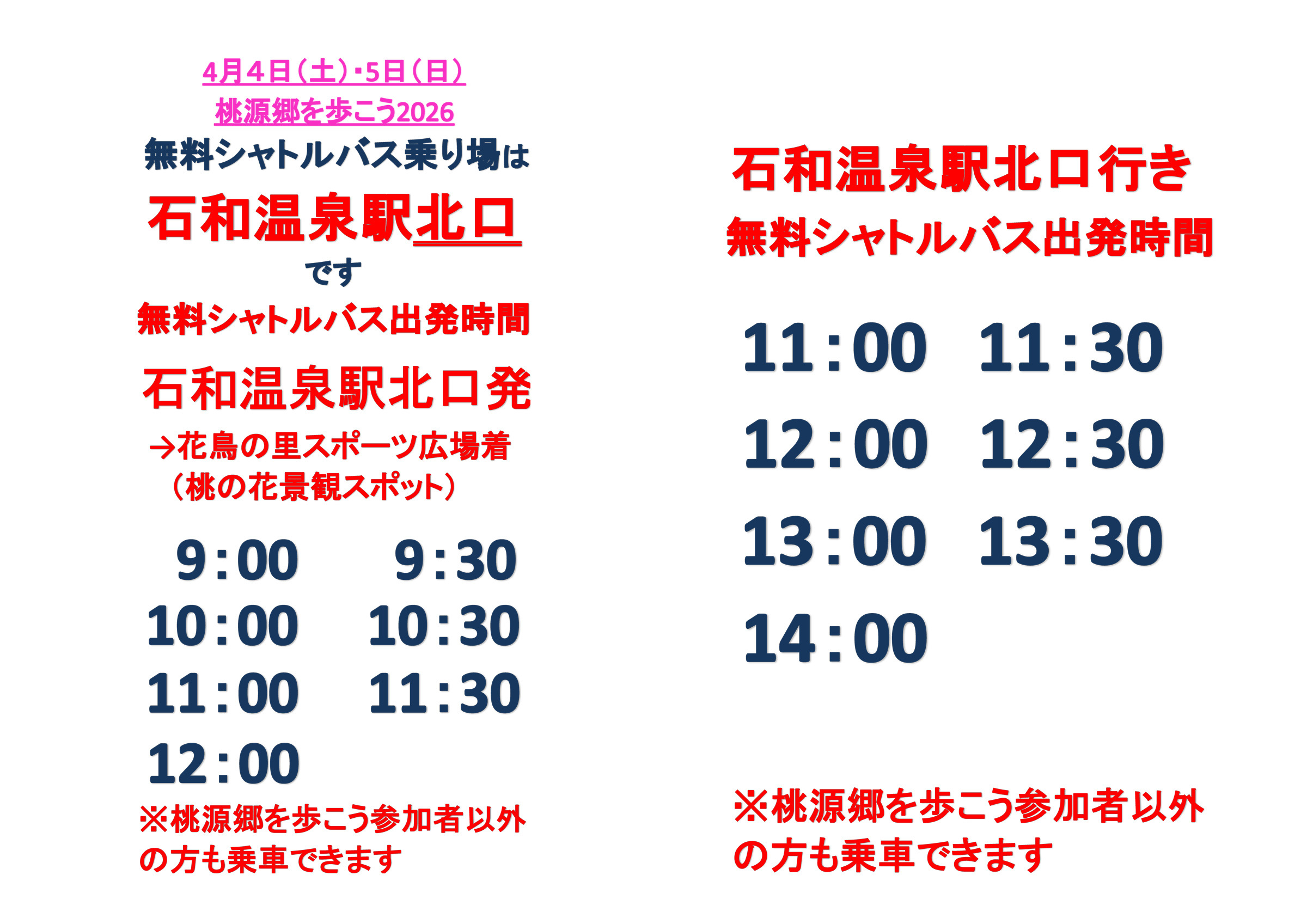 ・石和温泉駅北口から花鳥の里スポーツ広場まで9時から12時まで30分おきに随時無料シャトルバス運行、花鳥の里スポーツ広場発最終バスは14時。