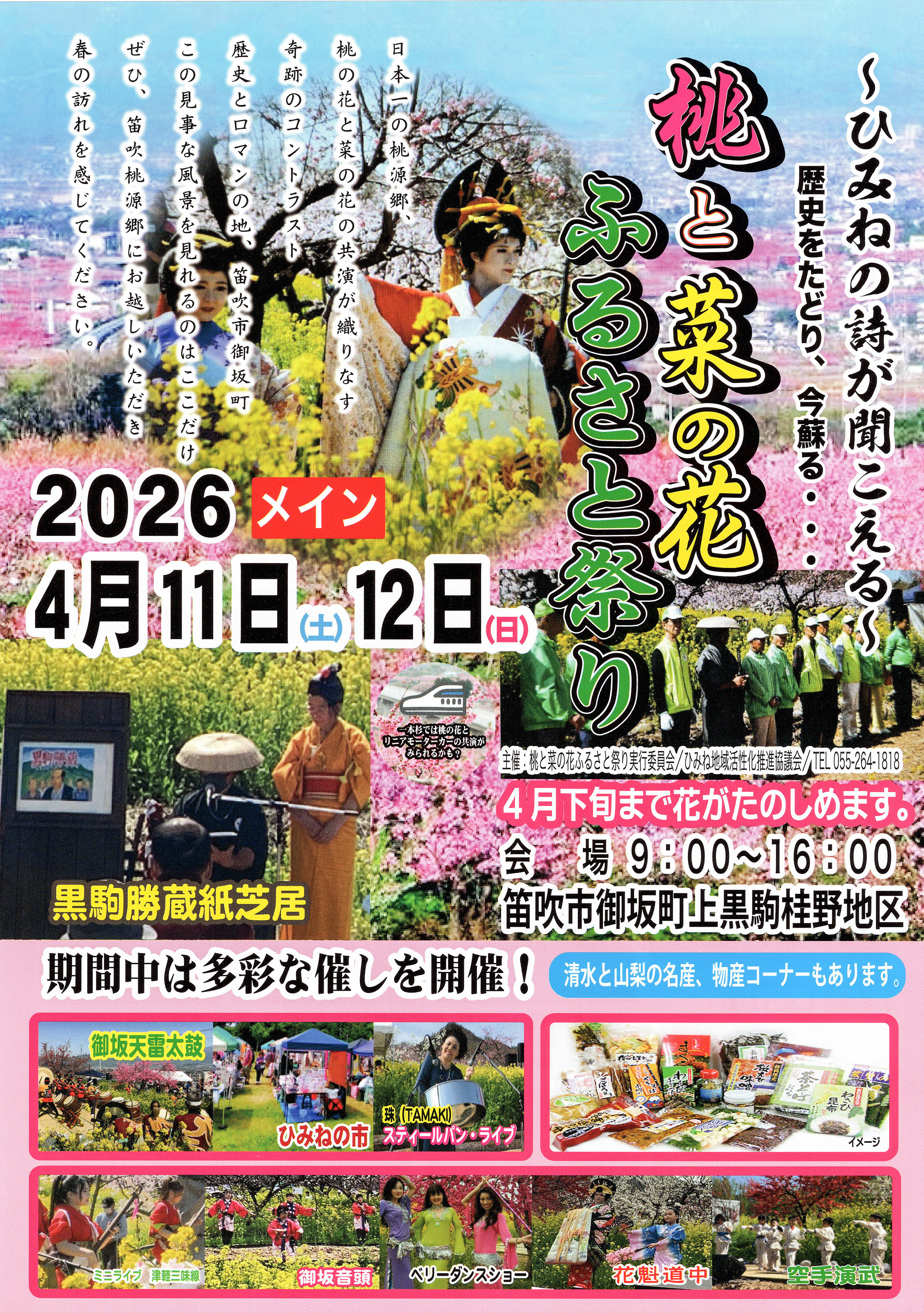 例年、3月下旬から4月上旬にかけ、日本一の作付面積を誇る笛吹市の桃の花が満開となります。市内全域がピンク色に染まる「桃源郷」をウォーキングしませんか? 開催日:2026年4月4日(土) 4月5日(日) スタート場所:花鳥の里スポーツ広場 (笛吹市御坂町大野寺250) ・受付時間 9時~14時(イベント終了15時) ・参加料 300円(小学生以上) ・コース内の3か所(埋草神社、花鳥山一本杉公園、大野山福光園)のうちいずれかで 花や風景の写真撮影をした後、受付に戻って写真を掲示していただいた方に笛吹市の特産品がもらえる抽選を行います。 ・もも及びシャインマスカット(収穫時に配送)、ワイン、ラーほー、笛吹市オリジナルラベルほりにし、桃ジュース、石和温泉湯の素など ・石和温泉駅北口から花鳥の里スポーツ広場まで9時から12時まで30分おきに随時無料シャトルバス運行予定、最終バスを14時 ●桃源郷春祭り/ 御坂会場のお知らせ イベント内容 ・9時~16時(5日は15時まで) ・御坂天雷太鼓や津軽三味線の演奏などステージショーあり(4日のみ) ・地元出店者による飲食の販売あり ※詳細チラシpdf>>> ![]() ●桃と菜の花まつり/ 黒駒桂野会場 ※詳細チラシpdf>>> ![]() ![]() |