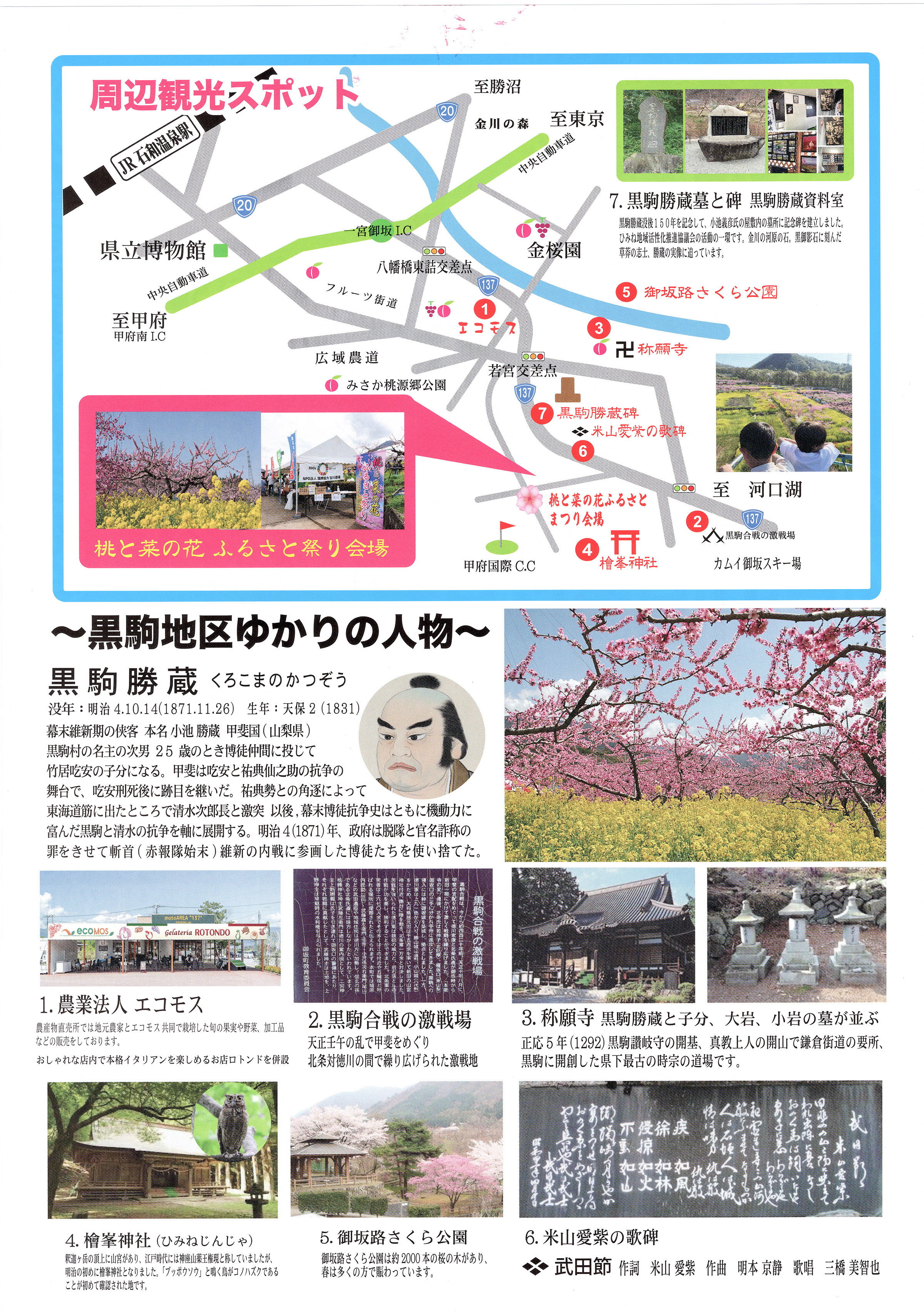 「境川ミズバショウ春まつり」を皮切りに、八代ふるさと公園での出店や桃や桜の景観スポットを巡る「桃源郷を歩こう2026」、電動自転車をレンタルしてお花見やお買い物スポットを巡る「桃源郷ROUTE34ライド&ウォーク」など、楽しい催しが目白押しです!ご家族、ご友人とお誘いあわせの上、ぜひご参加ください! メイン会場の八代ふるさと公園は期間中混雑が予測されますので3月28日(土)・29日(日)、4月4日(土)・5日(日)は臨時駐車場の「八代小学校」から無料シャトル【随時運行】をご利用ください。 ・八代小学校発9:00~16:00(予定)【随時運行】最終は八代ふるさと公園を16:30となります。 ※詳細は下方の項目をご覧下さい。 ※石和周辺グルメマップはこちら>>>笛吹市へお越しの際は是非ご参考に! ※開花速報はこちらから>>>(水芭蕉から2月より更新中!) |
